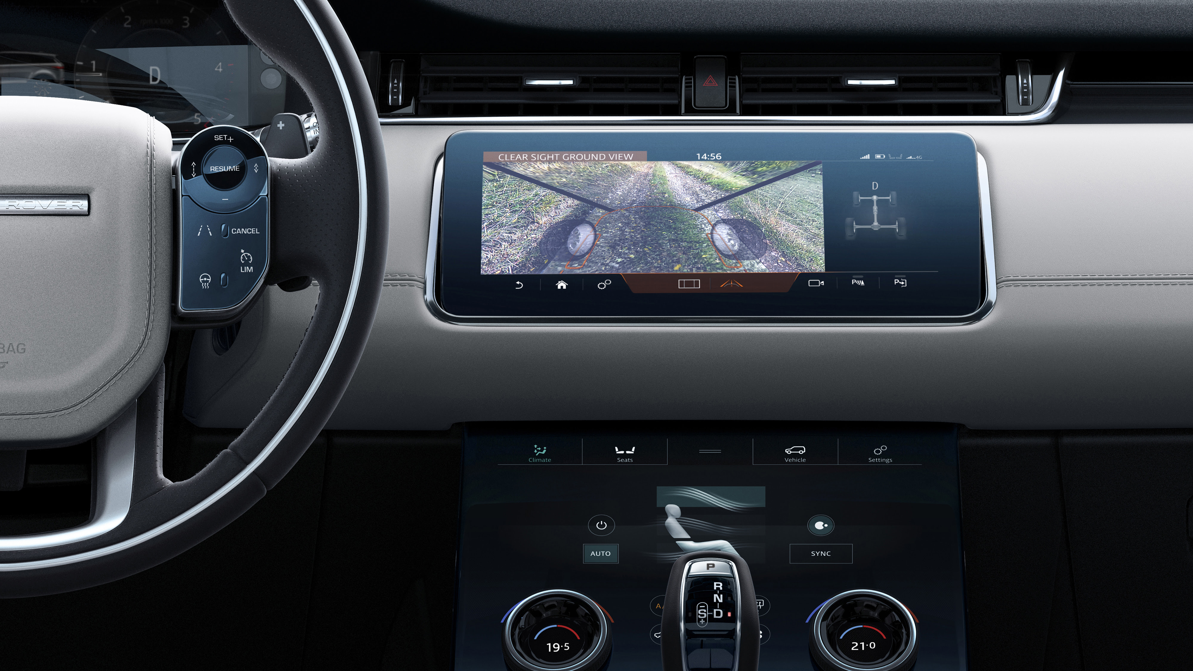 In the cabin, meanwhile, the Evoque features some clever new tech, including ClearSight technology, which has a couple of neat applications. This sees the rear-view mirror turn into an HD monitor, which means that should your rear view be obscured by a full boot, you can simply flick a switch and the mirror will switch to displaying a live feed from the Evoque's rear-facing HD camera.